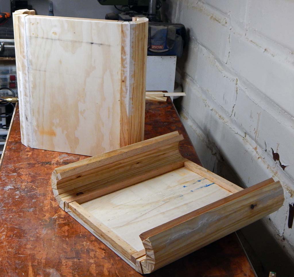 The cabs were built out of 3/4 inch plywood with 3/4 inch oak edge stiffeners. I had a good bit of scrap 3/4 inch oak sticks and some poplar and pine. I used most of the oak scrap on edges and used scrap pine and poplar sticks for internal bracing after the oak got used up. Both cabs required about 3/4 of a sheet of plywood total-- About 3/8 of a plywood sheet per cabinet. Plus the scrap 3/4" sticks, and most of an 8 foot long 2 X 12 inch pine board for making the radiused corners.