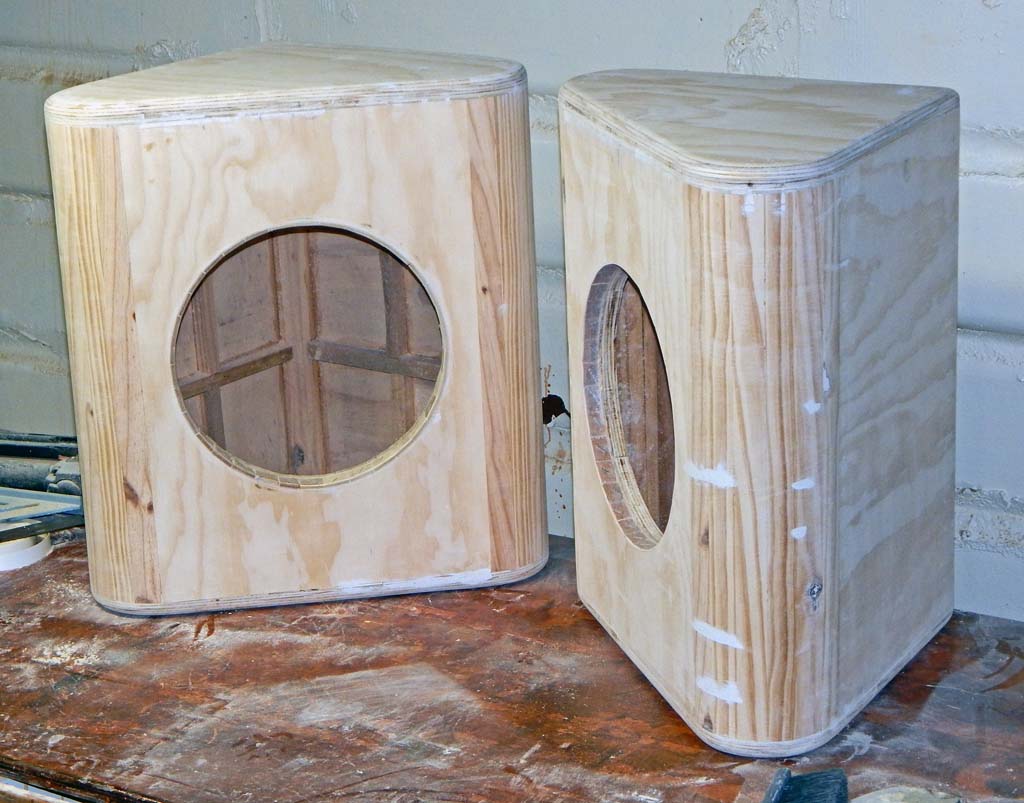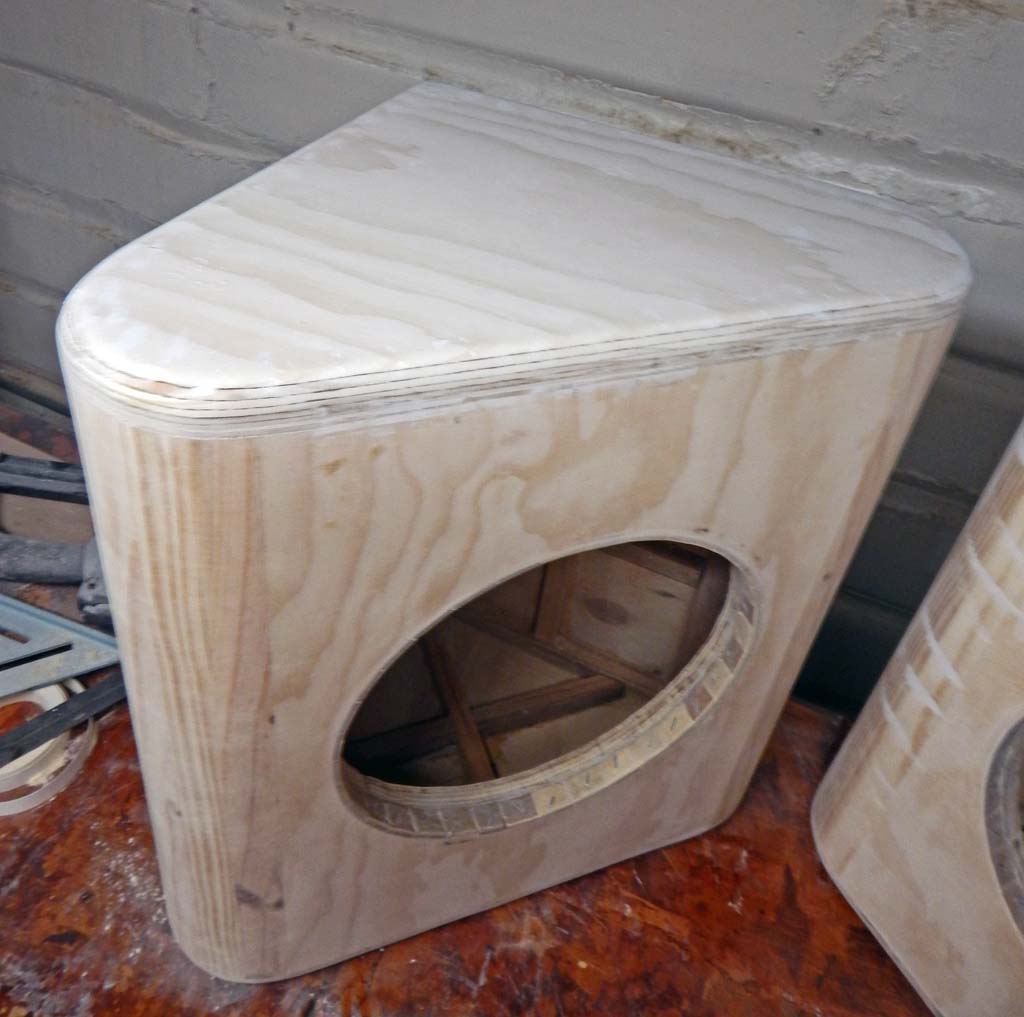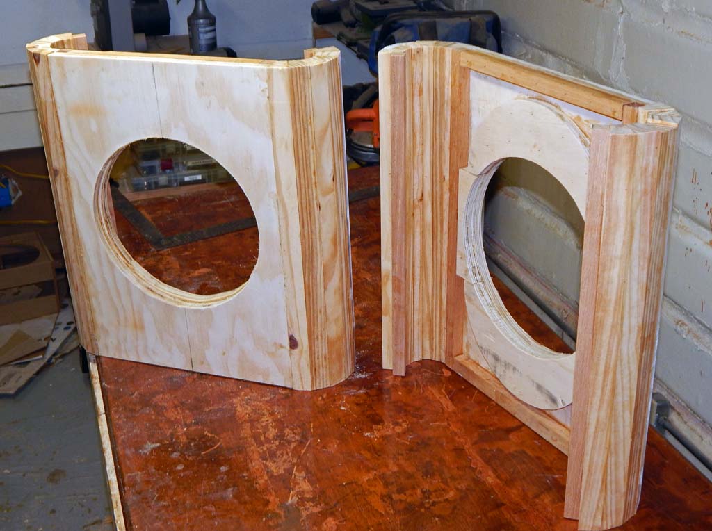 Speaker cutouts added. I used the hole cutout plywood pieces, trimmed on the bandsaw, along with a few pieces of scrap plywood, to double-up most of the front baffle board to 1.5" thick. Plywood circles are difficult scrap to figure out how to re-use. Was nice not to waste the wood. The radiused curves are also about 1.5 inch thick. The whole baffle board and curved corners are about 1.5" thick (except for a few small baffle board areas I was too lazy to fill with scrap).