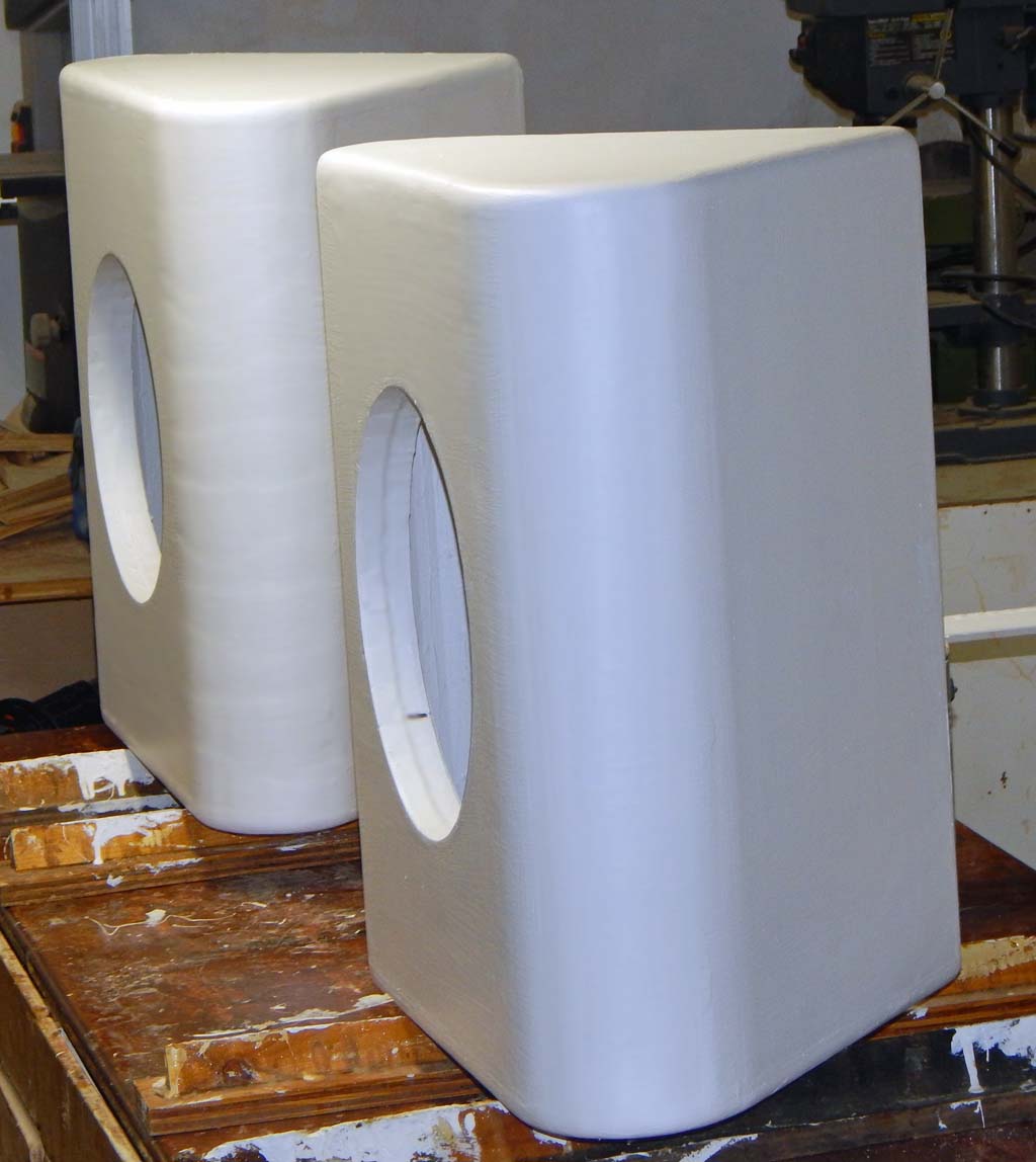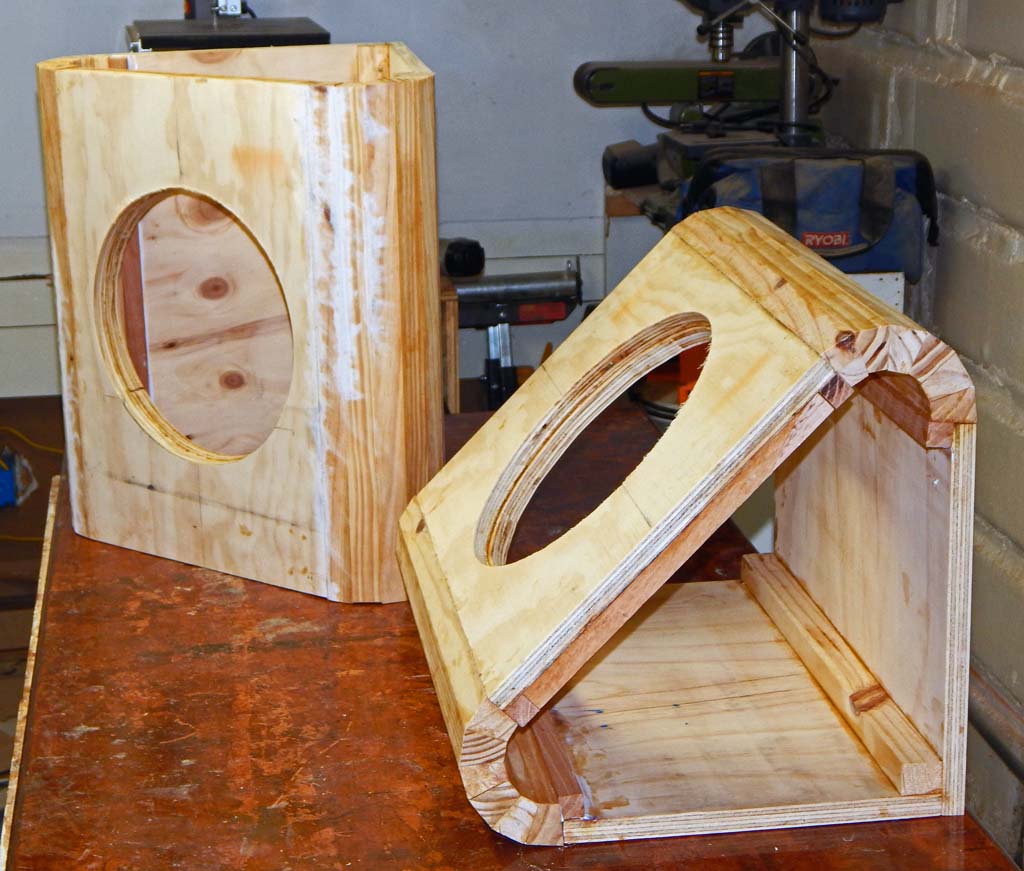 Pictured with the tops and bottoms added, making a total external height of 22 inches. The left cabinet has been routed and rough sanded and the right cab is ready to be routed and sanded. Before attaching the tops and bottoms, I reinforced inside surfaces with a 6 inch waffle grid of 3/4" sticks. I squirted caulk on all seams before adding the top and bottom. Finally added top and bottom bracing and caulked the top and bottom seams by reaching thru the speaker holes, which was not so convenient but do-able.