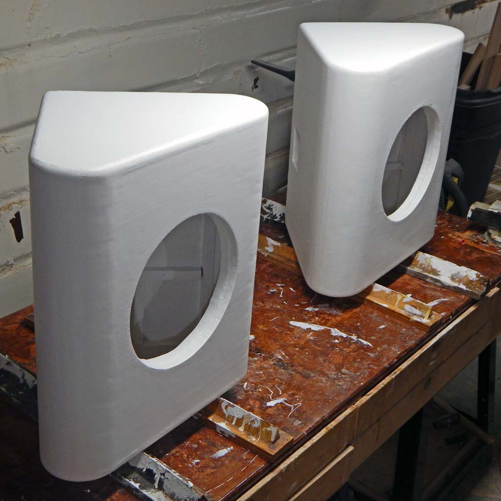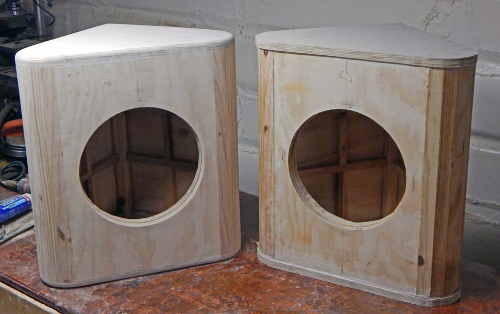 Triangular cabs seemed about as big as would fit the space. Cabs with internal volume big enough to be friendly to a 12” speaker. A 15 inch wide X 22 inch tall flat face. About 3.25 inch radiused curves-- 135 degree sweeps connecting the front baffle board to the two back sides of the triangular shape. The radiused curves smoothly tangent to both the front baffle board and the sides. Each radiused front-to-side corner has a smooth curve of about 8 linear inches. Perhaps the total unobstructed horizontal baffle-board width could “acoustically” be considered to be 15 inches of the flat front plus 16 inches of smooth curve, for an effective baffle board width of 31 inches? I'm too ignorant about speakers to know whether that is a proper way to think about it.