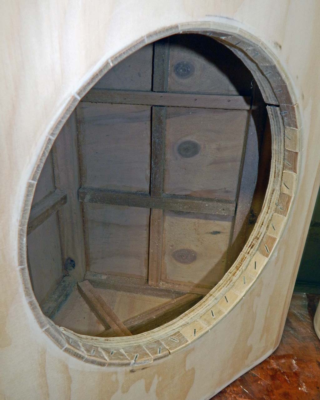 Internal detail photos which also show another carpentry error. I have a big router but never bought or built a good-quality circle cutting jig because I rarely need to route circles. On the earlier subwoofer cab and these coax cabs, I used a small rotozip router because a flimsy rotozip circle jig is the only one I had.