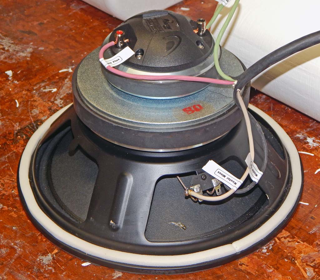 In this picture I was experimenting with small low-density balls of polyester stuffing placed in the horn throats to discover if that would “reduce horn diffraction” or change the frequency response or the sound.