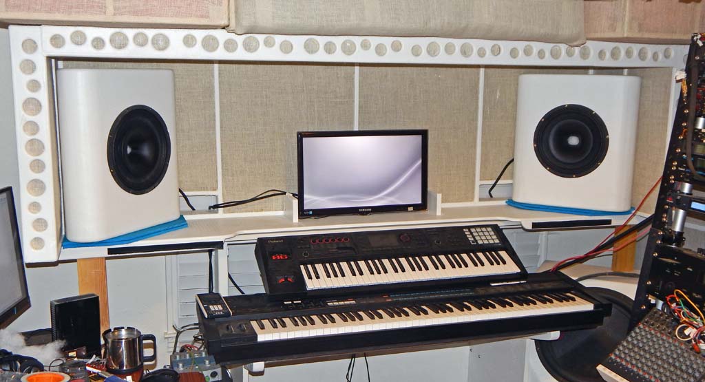 Here are the speakers as placed for initial setup and testing. The office was a mess after having temporarily removed the "very nearfield" treatments to install the new speakers and pull new four-conductor biamp speaker cables behind the keyboards and absorbers.