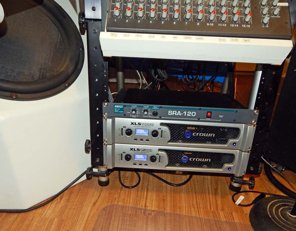 So got two new amps and a “relatively new” used amp. A Crown XLS 1500 for the subwoofer, a Crown XLS 1000 for the coax 12” woofers, and a used Ashly SRA-120 amp for the coax horns.