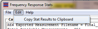 Stats Frequency Range: The frequency range used to calculate the stats. The default frequency range is 40 Hz to 10 Khz. You can right click on data lines in the REW Measurements box to change the frequency range, after which the stats are recalculated based on the new frequency range.