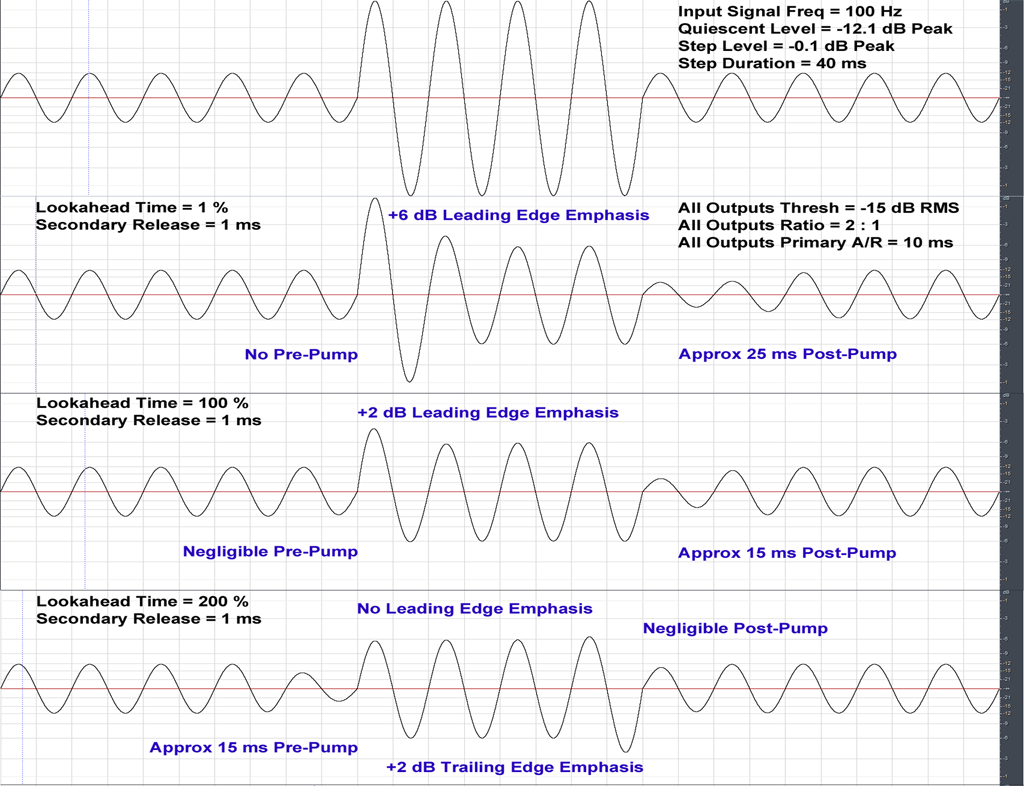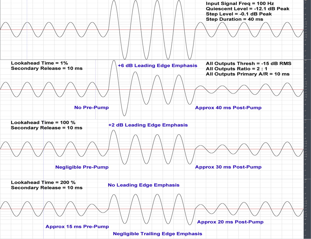 In the first illustration, all three example outputs have a Primary Attack/Release of 10 ms and the shortest possible 1 ms Secondary release. Lookahead time is the only difference. The first plot with minimal lookahead shows no pre-pumping and allows a +6 dB overshoot to leak thru the compressor before the A/R envelope can catch up. The second plot with 100 Percent (10 ms) lookahead shows very slight pre-pumping, only a +2 dB overshoot, and shorter-duration post-pumping. The third plot with 200 percent (20 ms) lookahead has more pre-pumping, no leading edge overshoot, about +2 dB of trailing edge overshoot, and minimal post-pumping.