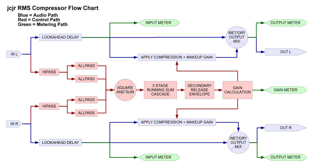 I usually set Wet / Dry mix at 100 percent, in which case none of the un-compressed signal appears at the output. At 100 percent, RMSComp mixes 100 percent of the compressed signal with 0 percent of the un-compressed signal so the result is the same as no mixer at all. Some people favor “parallel compression” and it was easy enough to add the Wet / Dry Mix feature in case some users may find it useful.