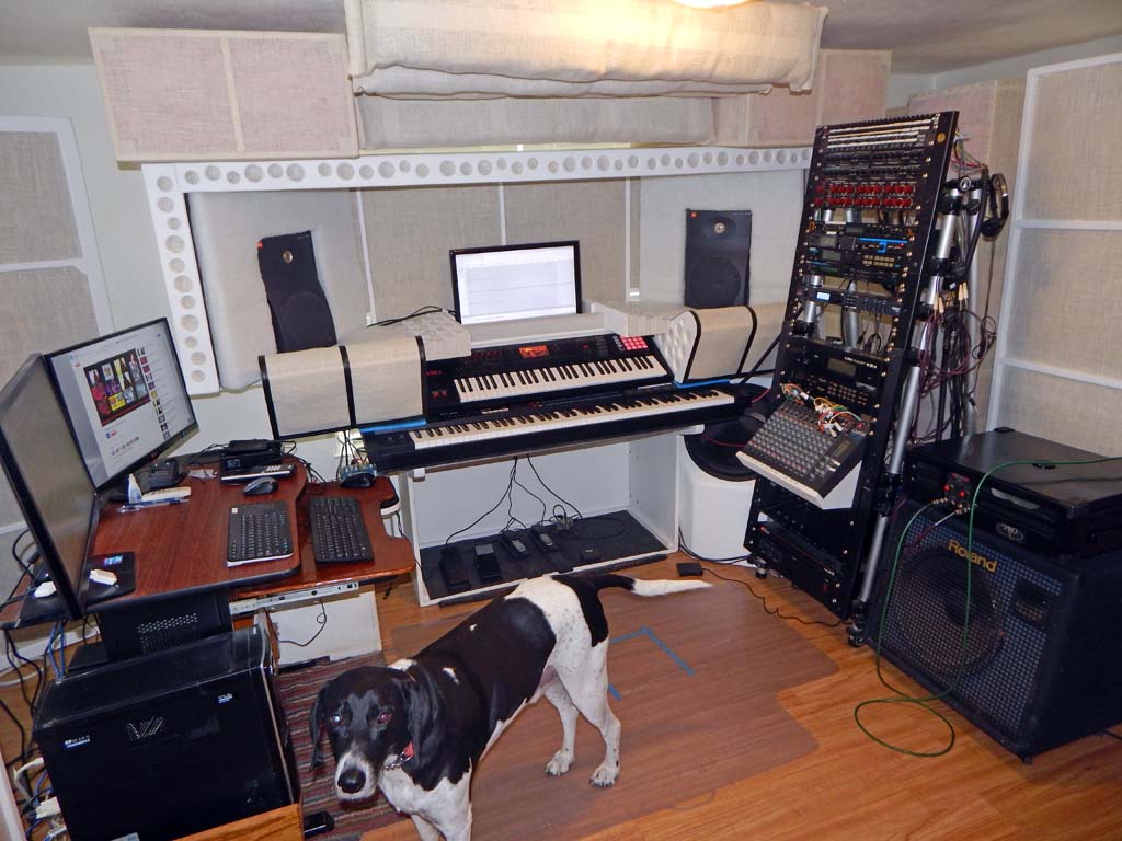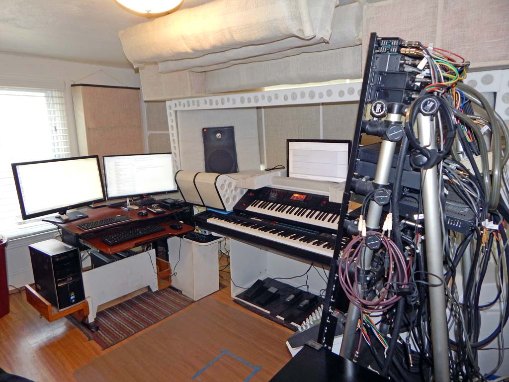 After remodeling the basement apartment in my old house, I decided to set up a new office in the basement apartment living room. I sorted through old gear from my old long-neglected free-standing home studio. Winnowing the legacy equipment down to essentials. Targeting an ergonomic, compact workspace for programming, keyboard playing, music listening, and possibly composing/recording should I ever regain interest in such.