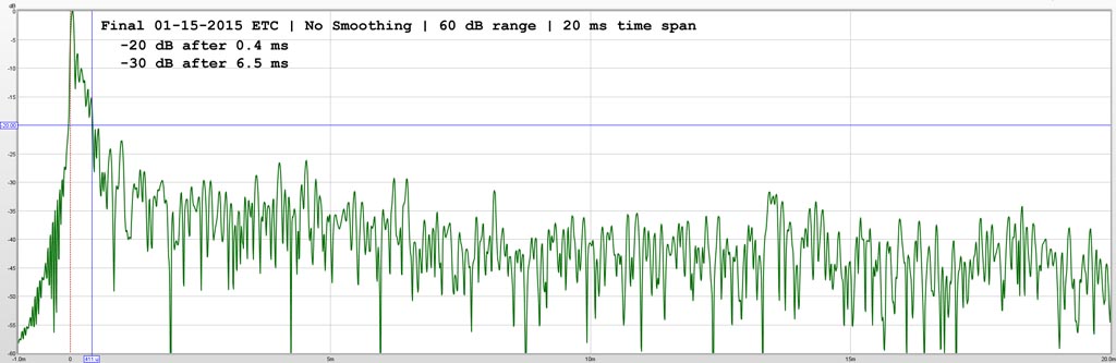 I am ignorant about interpretation of ETC graphs, but here are 20 ms and 100 ms ETC graphs for whatever utility they may provide to interested experts. As best I can tell, it shows a fairly low level of early reflections, and no “haas kicker” late reflections, but I prefer a non-reflective “dead” listening space.