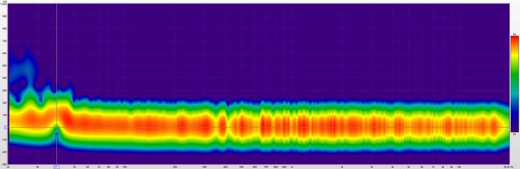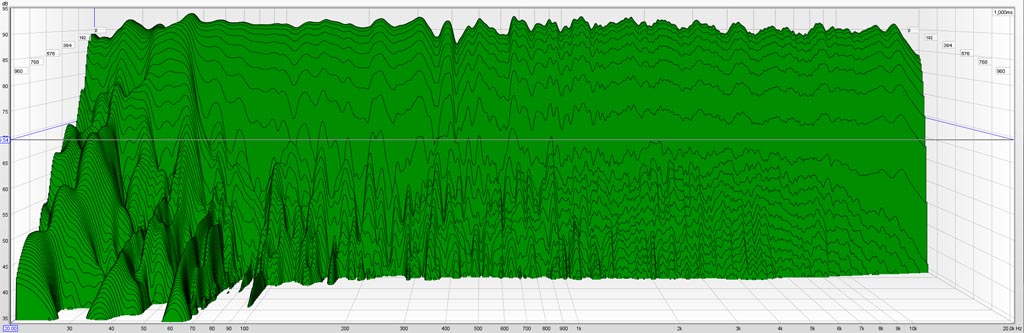 The waterfall plot has time duration of 1000 ms and vertical resolution of 60 dB. The 60 dB decay as viewed in the waterfall is about 200 ms in the highs, trending toward 400 ms down to 70 Hz. 60 dB decay extends toward 1000 ms in the low bass.
